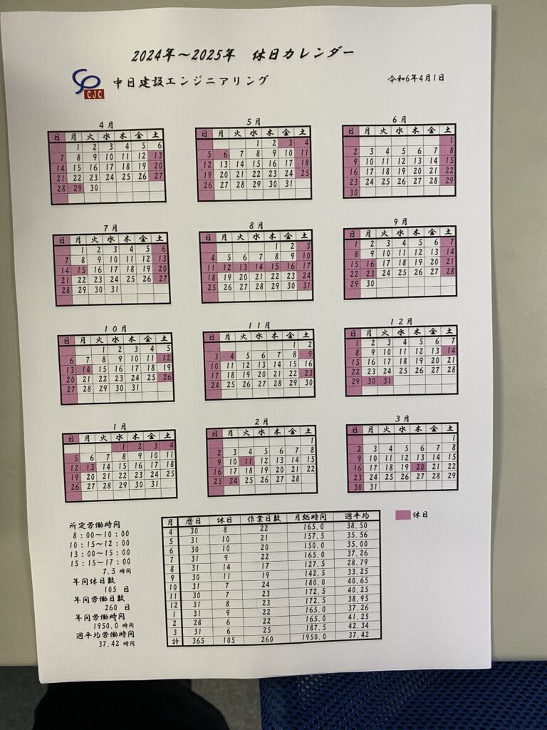 働き方改革を実施すべく4週8休ベースでの休日予定を組んでみました。まだまだ完全に週休二日制の現場ばかりではないため、繁忙期での土曜日休みは予定に入れてませんが、有給休暇は別にありますので、実際は最大で125日の休暇になります。今年度の様子で来年度以降の休日数を110日前後にできればいいなと思っています。